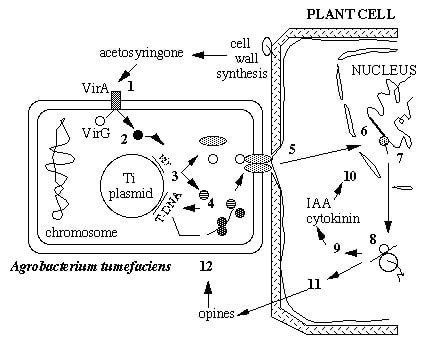 Hassas yaralı bitki dokularından içeri giren A.tumefaciens Ti plazmidinden bitki genomuna T-DNA yı transfer etmektedir. Ti Plazmidi bitkide oksin ve sitokinin üretimini teşvik eden genleri içermektedir. Transferin ardından 3-4 hafta içerisinde Ti plazmidinin kromozom üzerindeki bu gen grubu sayesinde normal bitki hücrelerini transforme etmekte ve bitki hücrelerinin kontrolsüz büyüme ve bölünmesi sonucunda urlar meydana gelmektedir.