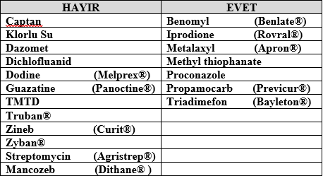 İnsektisit ve gübrelerin kullanılmasında bir sakınca yoktur. Tereddüt yaşadığınız bir kimyasalı kullanmadan önce lütfen bayinize veya firmamıza başvurunuz. Nogall uygulamalarından sonra topraktan kullanılamayan ve kullanılabilen fungusitler HAYIR ve EVET olarak aşağıda belirtilmiştir.