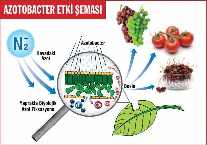 Bu organizmalardan Azotobacterler spp. havanın serbest azotunu azot fiksasyonu ile organik azota ve nitratlara dönüştürürler. Azotobacter spp. türlerine ait mikroorganizmalar serbest yaşayarak herhangi bir bitki ile simbiyotik (ortak) bağ içermeden havanın gaz haldeki azotunu hücreleriyle fikse edip besin olarak kullanılır duruma getirirler. Böylece yapay yoldan elde edilen azot yerine doğal yollardan bitkiler için gerekli besin sağlanmış olur. Ayrıca azotobacter türleri salgıladıkları ; metabolitler, vitaminler, bitki gelişim düzenleyici maddeler ile bitkiyi birçok hastalığa karşı korurken, bitkide istenen belirgin bir verim ve kalite artışını da sağlarlar.